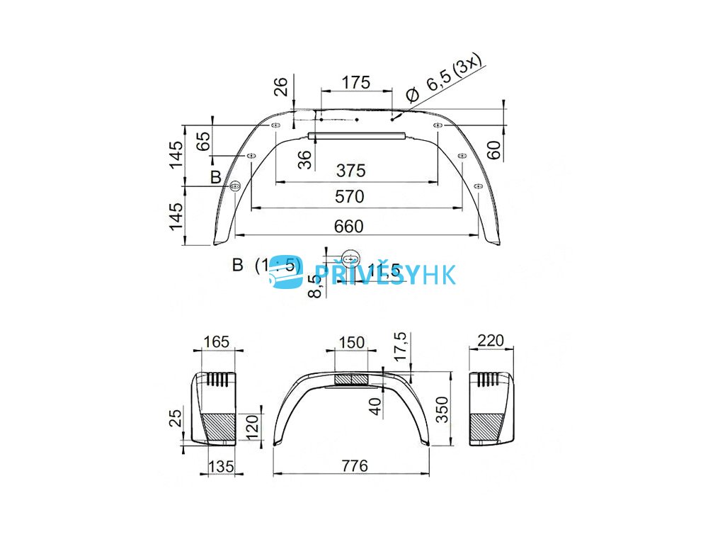 - Boční strana blatníku je opatřena oválnými otvory 8,5 x 11,5 mm pro snadnou montáž blatníku k bočnici přívěsu