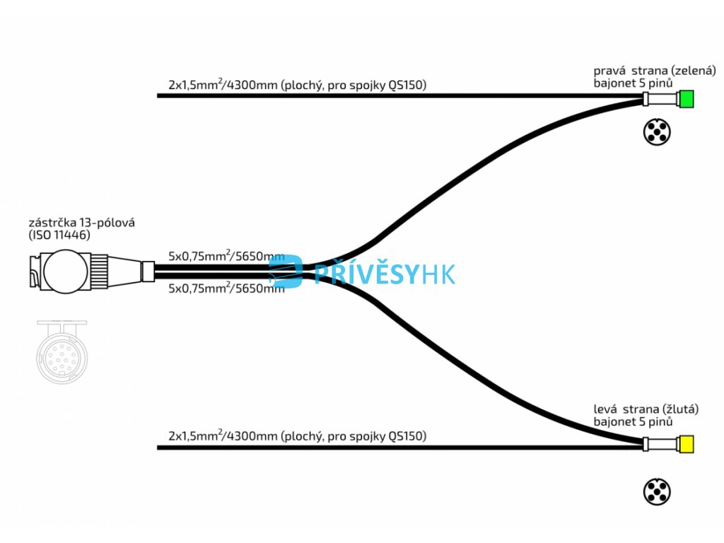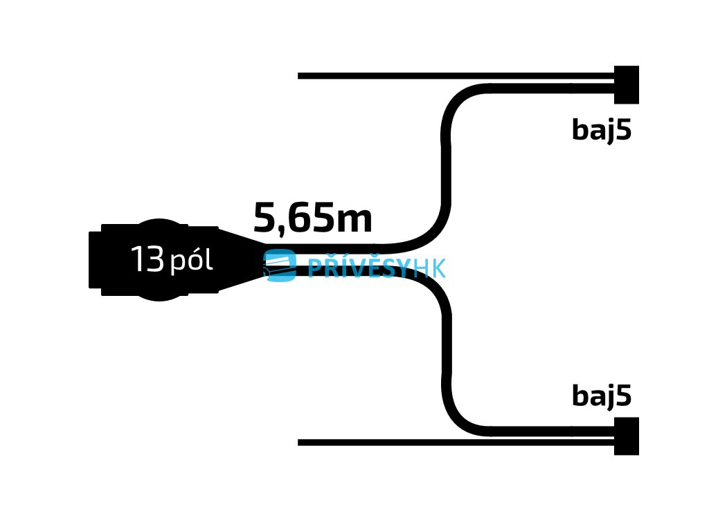 - Z třináctipólové zástrčky jsou vyvedeny dvě větve pětižilových kabelů 5x0,75 mm2 (levá a pravá) o délce 5650 mm.