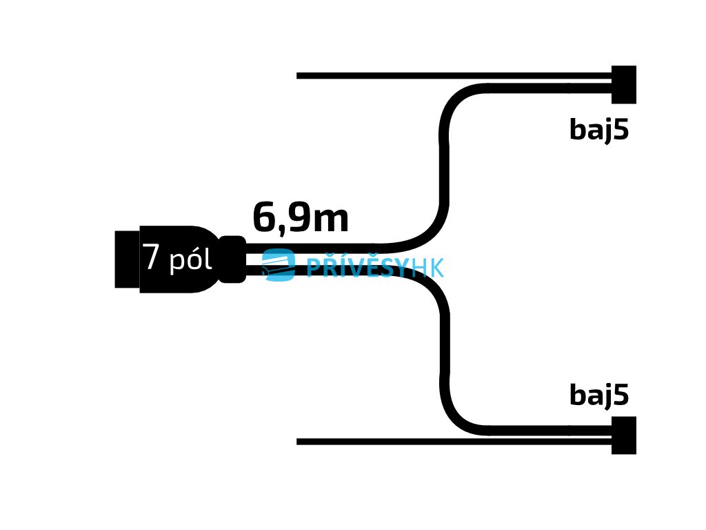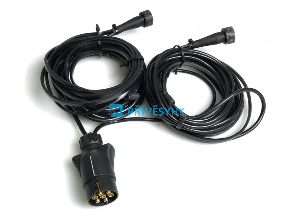 - Ze sedmipólové zástrčky jsou vyvedeny dvě větve pětižilových kabelů 5x0,75 mm2 (levá a pravá) o délce 6900 mm.