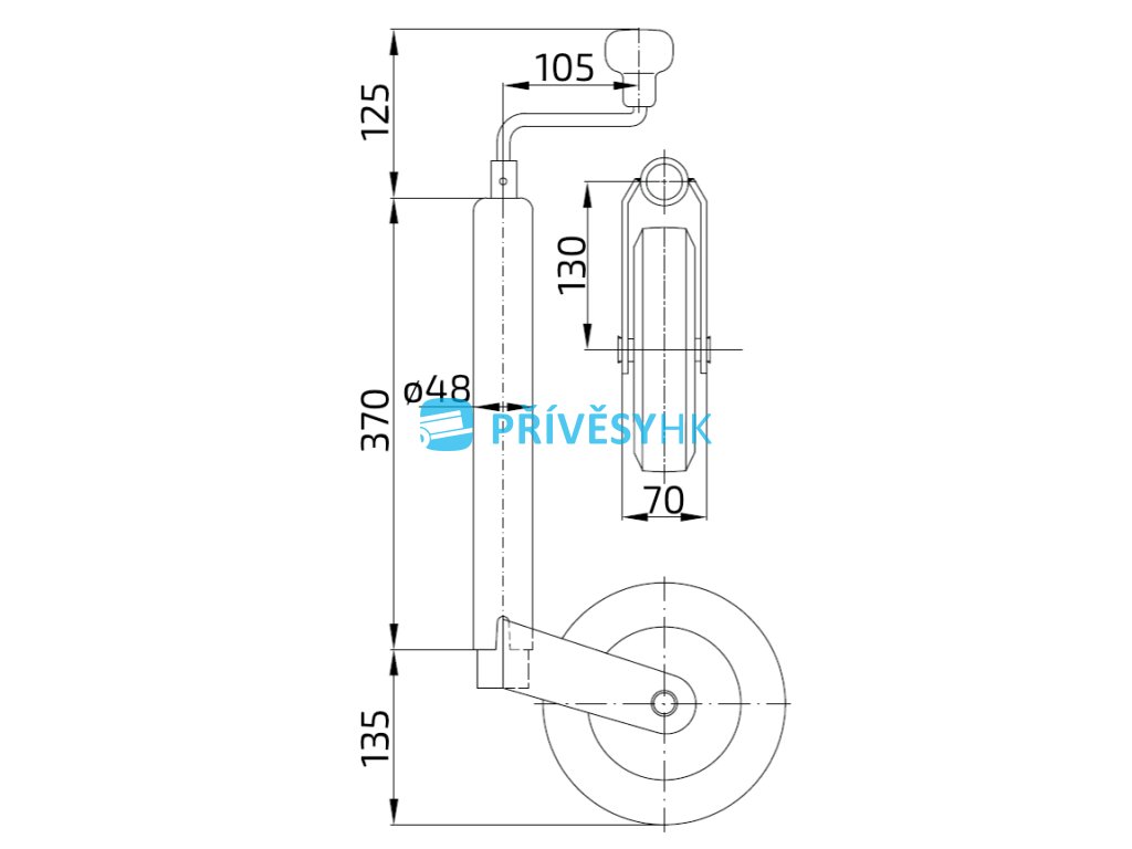 Standardní výškově stavitelné opěrné pojezdové kolečko Winterhoff s pohodlnou kličkou, vhodné pro nebrzděné i brděné přívěsy. Disk kolečka je vyroben z odolného plastu. Vysoké madlo možňuje pohodlný úchop při točení kličkou.