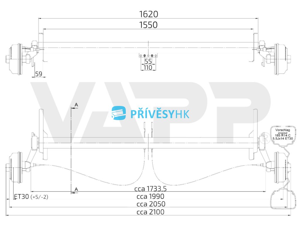 Náprava AL-KO CB 1355 (1350kg), a=1550 mm, c=2050 mm (náhrada BPW pro Adria)