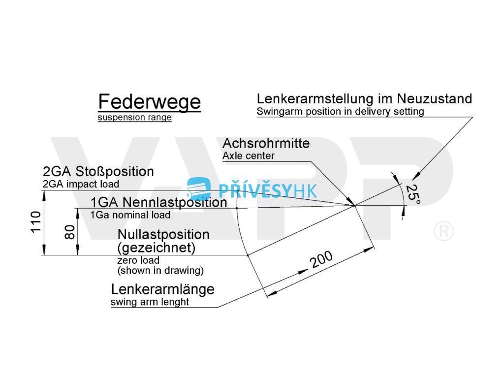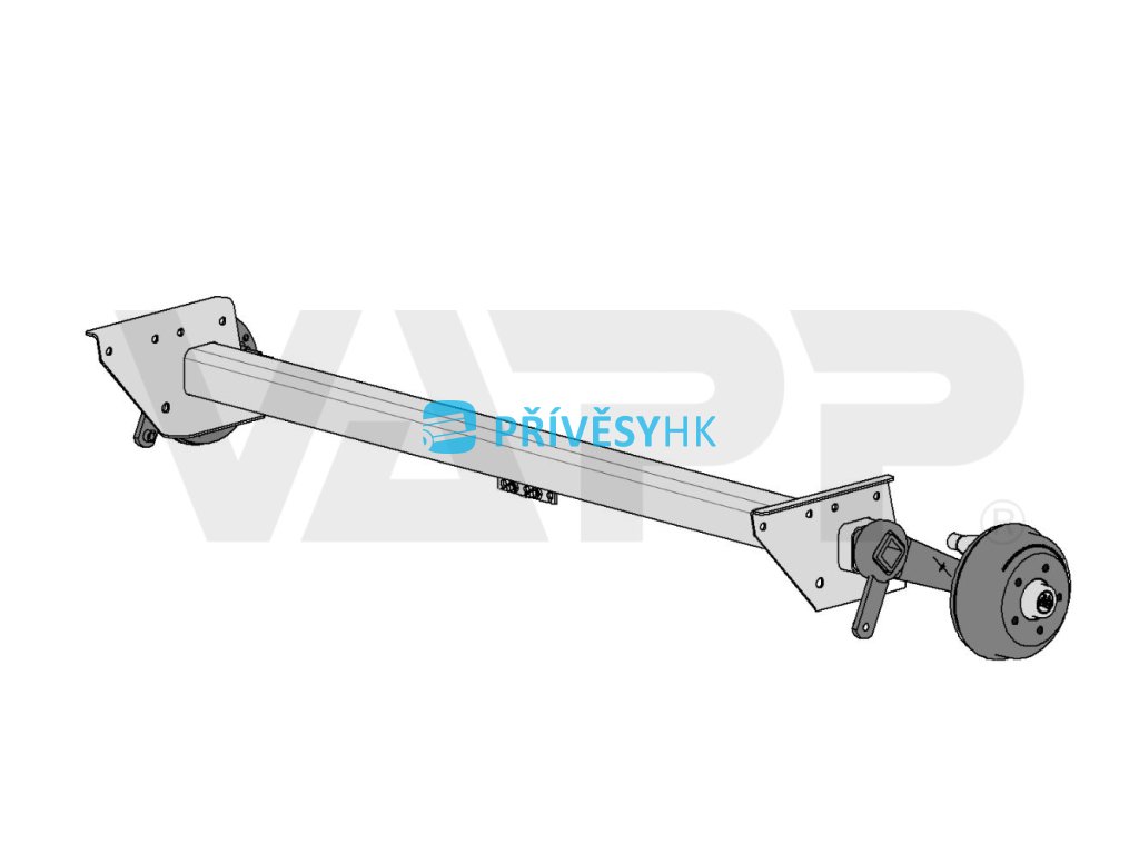 - Náprava je dodávána bez lanovodů a kolových šroubů. Vhodnou délku lanovodů je třeba zvolit dle konstrukce přívěsu, vedení a uchycení lanovodů. Dosedací plocha kolových šroubů musí odpovídat dosedací ploše disků. Vhodné kolové šrouby a lanovody najdete v souvisejících produktech. Doporučená délka lanovodu 1030/1255 mm.