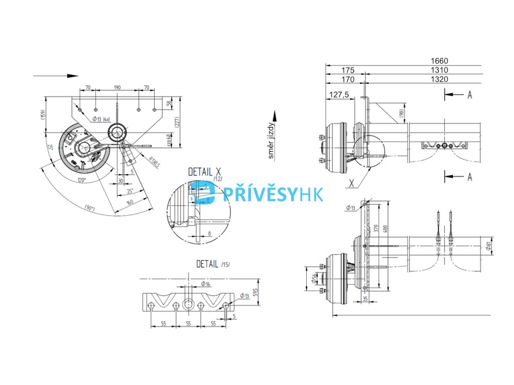 Náprava KNOTT GB 13 (1350 kg) b=1320 mm, c=1660 mm, 200x50, 112x5, patky 159, Sacher