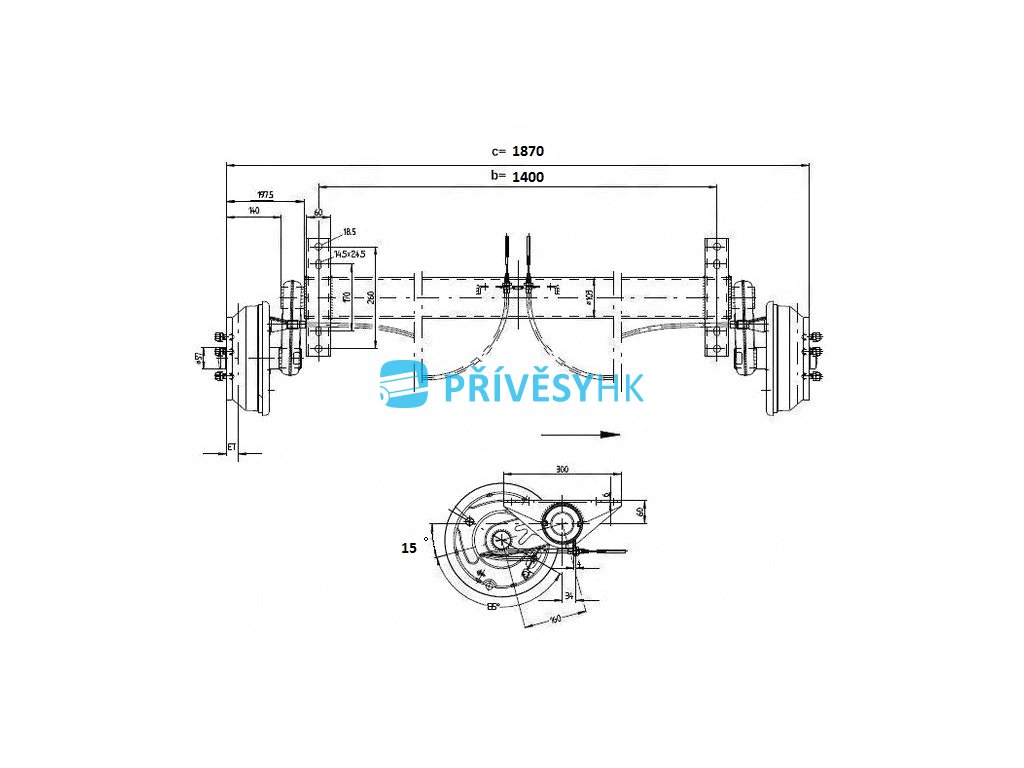 Náprava KNOTT GB 18 (1800 kg) b=1400 mm, c=1870 mm, 250x40, 112x5, s přípravou pro tlumiče