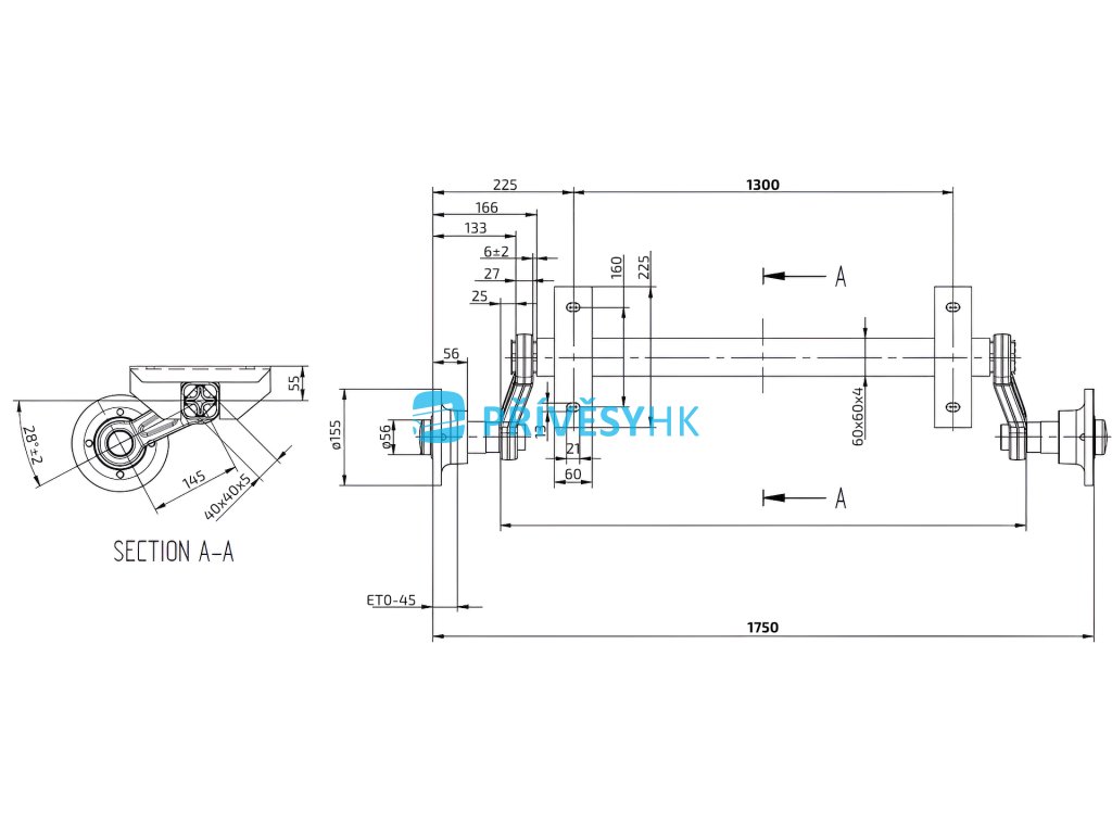 Náprava KNOTT VG 7 (750 kg) b=1300 mm, c=1750 mm, 100x4, patky 55