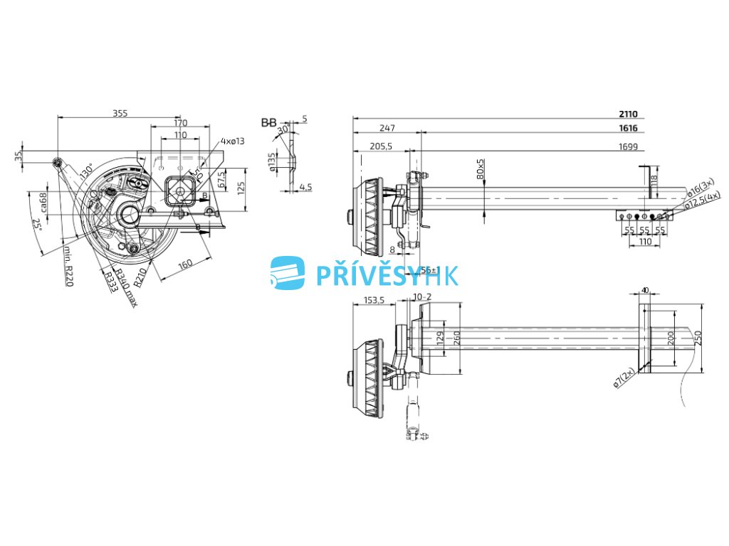 Náprava KNOTT VGB 18 (1800 kg) b=1616 mm, c=2110 mm, 250x40, 112x5