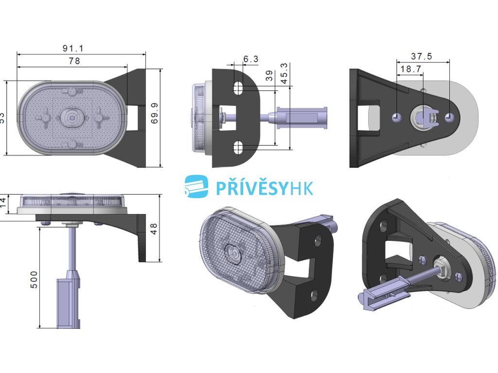 Přední obrysová svítilna s integrovanou odrazkou na držáku. Díky LED technologii odolné vůči provozním vibracím a povětrnostním vlivům odpadají starosti s uklepanými žárovkami. Flexibilní měkký držák lze použít pro montáž zboku na levou či pravou stranu, nebo podvěsem. Ze svítilny je vyveden 50cm kabel zakončený konektorem QS150 - tedy rychlospojkou pro snadnou montáž na plochý kabel 1,5mm2.