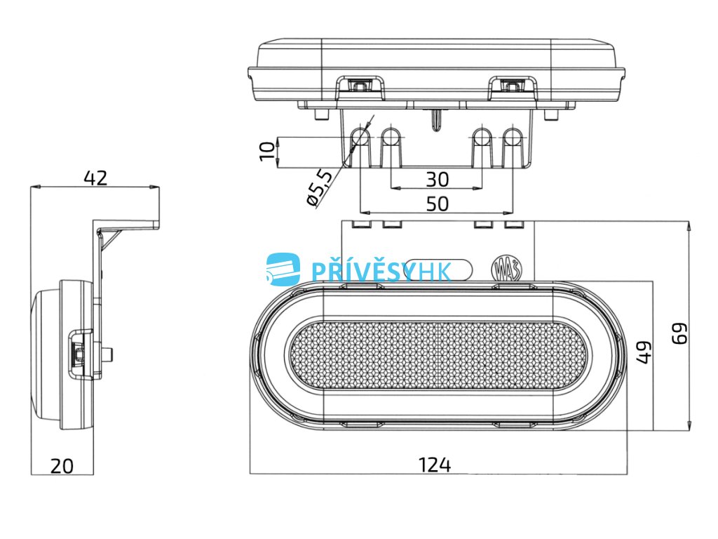 Přední obrysová LED svítilna s efektem neonu a integrovanou bílou odrazkou. Montáž svítilny probíhá přes nacvakávací plastovou lištu, díky čemuž jsou šrouby elegantně ukryté pod svítilnou. Montážní lištu lze upevnit na přívěs přímo, anebo zavěsit pomocí přiloženého držáku. Homologace umožňuje montáž svítilny ve svislé i vodorovné poloze.
