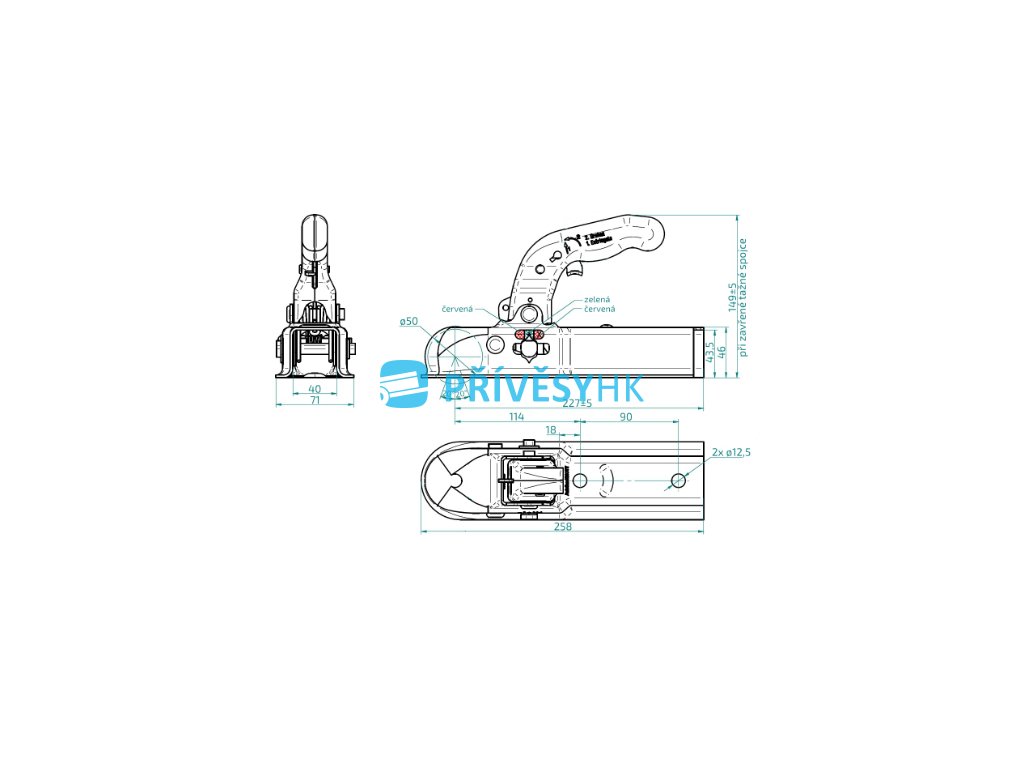 - Spojka slouží k bezpečnému připojení přívěsu k tažnému zařízení se standardním kulovým čepem pr. 50 mm, někdy označovaným také jako "koule ISO 50" nebo jako spojovací zařízení třídy A50-X (případně A50-1 až A50-5).