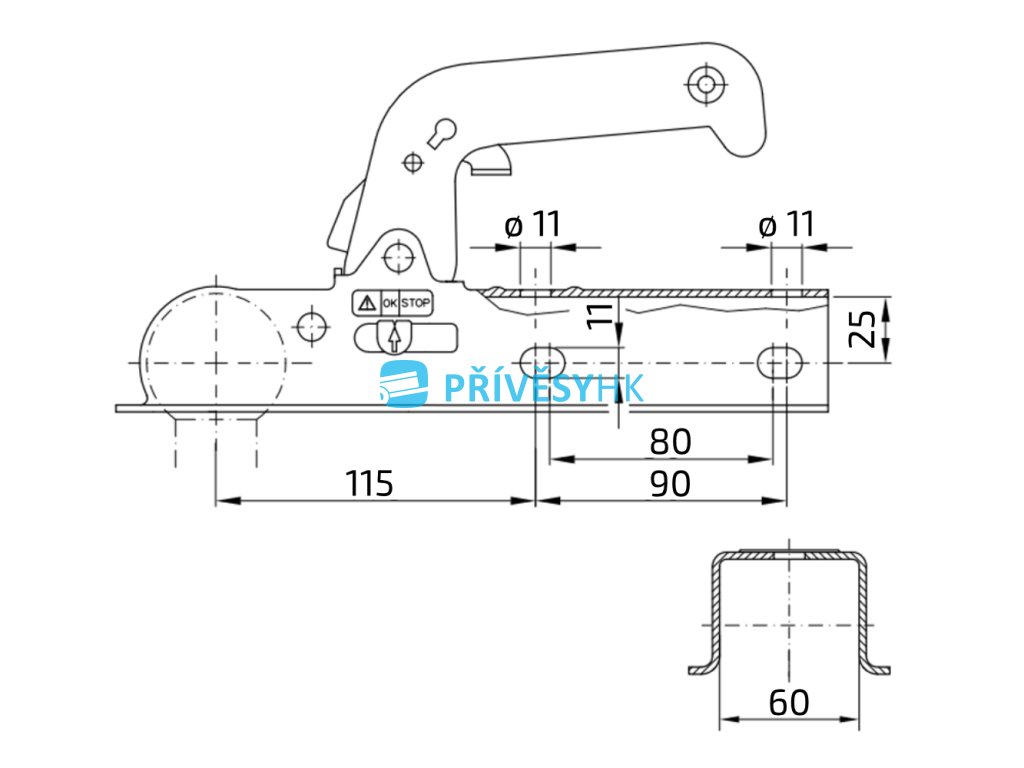 Tažná spojka 800 kg na oj čtyřhrannou oj 60x60 mm, vhodná pro nebrzděné přívěsy.Možnost uchycení šrouby M10 (nejsou součástí dodávky) horizontálně nebo vertikálně, případně do kříže.Rozteč otvorů pro svislé šrouby je 90 mm, rozteč bočních otvorů pro vodorovně vedené šrouby je 90 mm.Doplňkové parametry