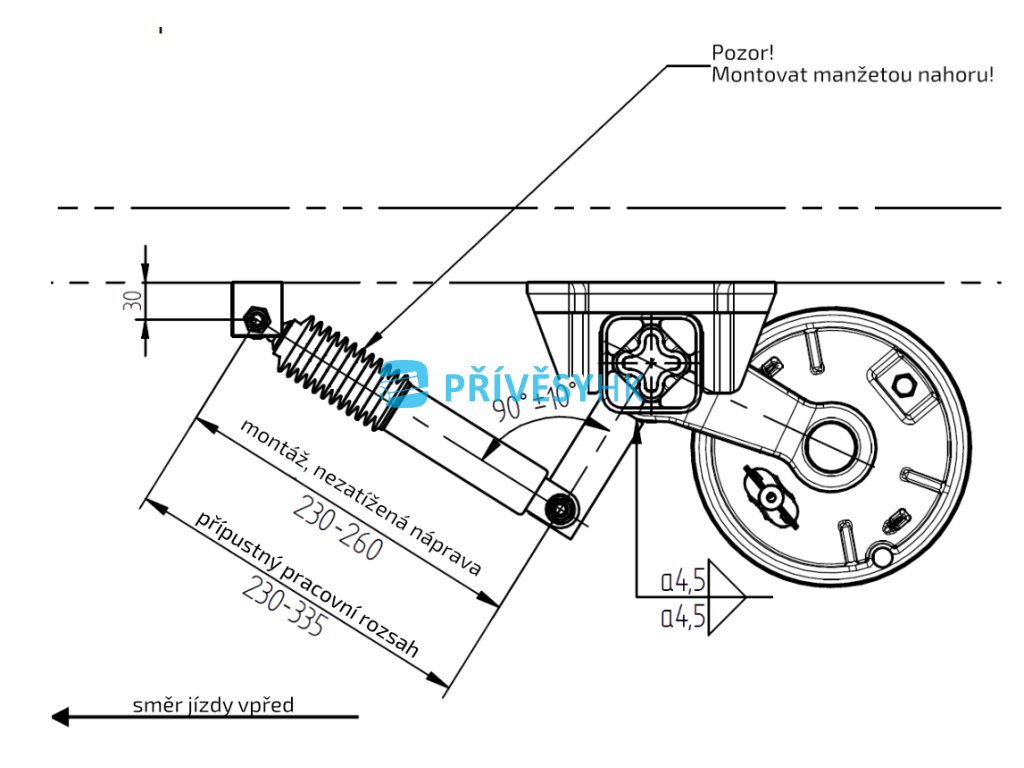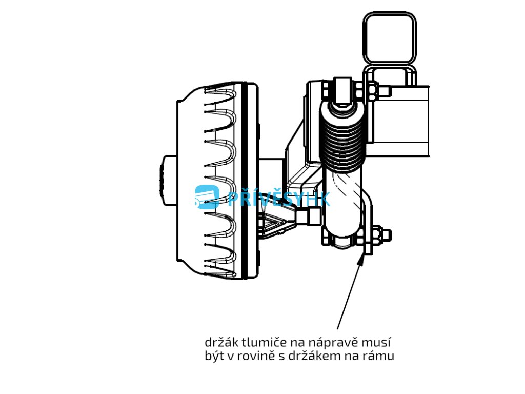 Originální tlumič k nápravě KNOTT, verze pro montáž před kolo, manžetou tlumiče směrem nahoru - viz výkresy ve fotogalerii.