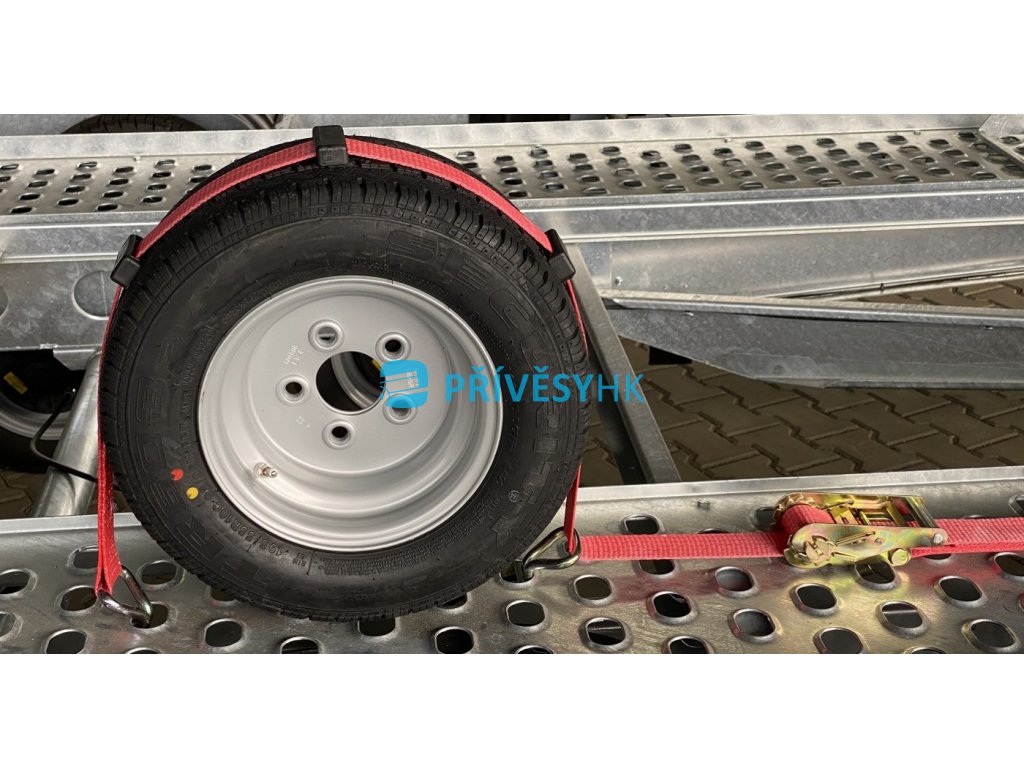 Upínací souprava pro přepravu automobilů. Ideální pro použití na přívěsech a odtahovkách s perforovanou ložnou plochou. Použití tří háků umožňuje pevné a bezpečné uchycení přes kolo převáženého automobilu.