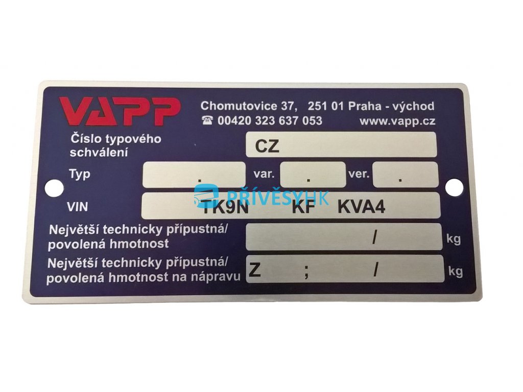 - Výrobní štítek dodáváme pouze vyražený dle předloženého technického průkazu přívěsu VAPP