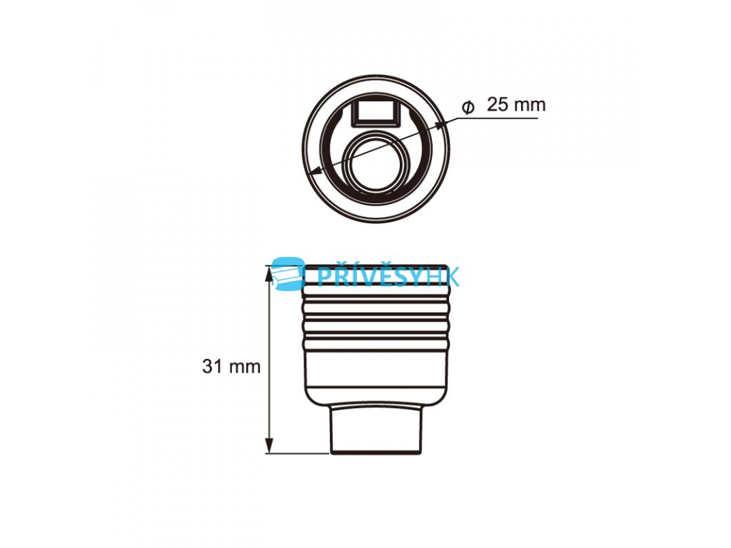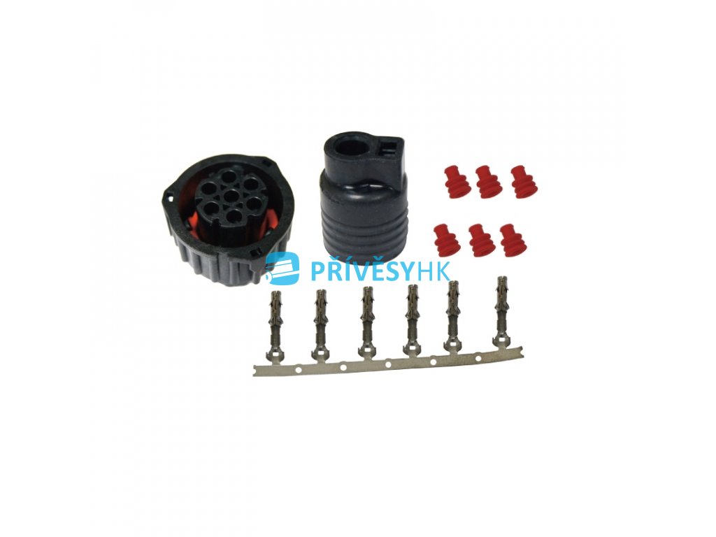 Standardní bajonetový AMP konektor s osazením pro 7 pinů. POZOR! Konektor je určen pro použití na přívěsových sdružených svítilnách, a proto balení zahrnuje pouze šest pinů. Zdířka jednoho pinu zůstává neosazena (pro levou i pravou svítilnu stačí osadit kostru, koncové, brzdové, směrové, mlhové a couvací světlo, tedy pouze šest pinů).