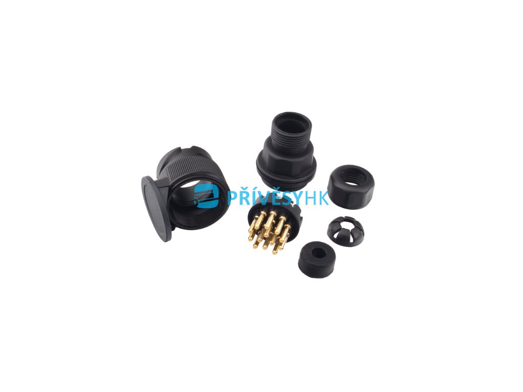 Zástrčka 13pólová dle ISO 11446. V kompaktním zkráceném provedení. Dodáváno s jednou gumovou průchodkou. Lze použít na elektroinstalace většiny přívěsů. Jednotlivé vodiče se k pinům připojují pomocí šroubků.